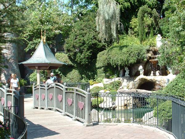 Now it’s time to head to Sleeping Beauty Castle. Cross the drawbridge and look for Snow White’s fountain and her Wishing Well on the right.