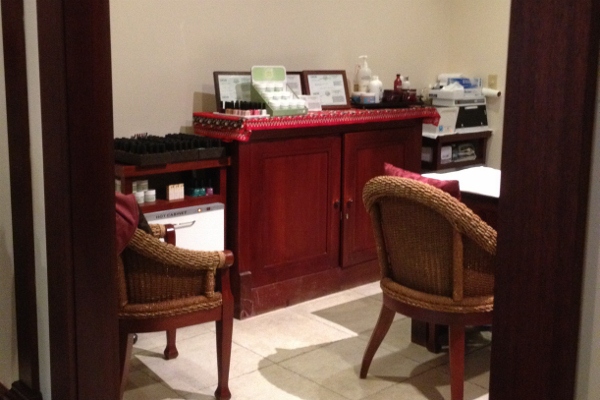 There was one area of the salon that neither one of us took advantage of (although I REALLY wanted to) and that was the salon for manicures and pedicures.   They also use this area to display the higher-end products they use in treatments and facials.   The decor of this room tries to make an otherwise industrial area look and feel like something more, by way of the carved Balinese woods and wicker.  As I poked around, I was impressed with how clean and organized the area appeared.   If you normally hit your local nail joint, you know what I mean.