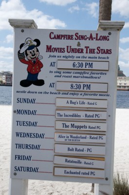 The beach is another semi-unique feature of this resort. Several lounge chairs and a camp fire pit are found on the beach along Crescent Lake with a fantastic view of the Boardwalk. In the evenings, there is a campfire sing-along and movies are shown here on a large, inflatable movie screen.