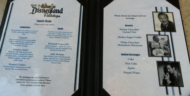 We also gave our lunch preferences right away. Choices included the following sandwiches: Caprese, chicken salad, or roasted turkey; or salads: roasted vegetable or Jolly Holiday. We could choose either freshly made chips or fruit, and our dessert choices were: Mickey Chocolate Carmel Tart, Mickey sugar cookie, or white chocolate Matterhorn macaroon. From what I could see, everyone chose the Mickey Chocolate Carmel Tart.