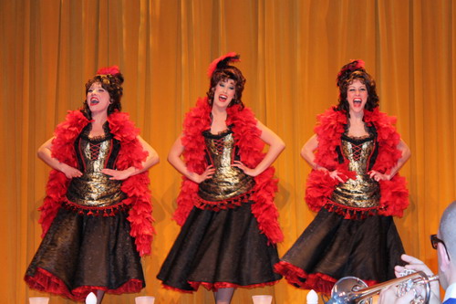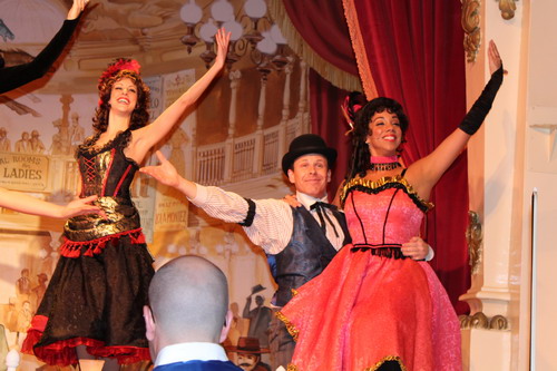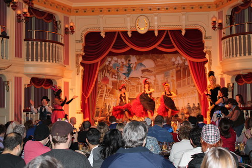 The Golden Horseshoe Saloon serves lunch items, snacks, and drinks before the show. Since we were going to the dinner show we did not order any food, but some of it looked pretty good. The dessert was so cute. It was a red velvet cake with a cookie in the shape of a Can-Can dancer’s leg sticking out. For the 2:00PM show we sat in the front, behind the four-piece band. They stop serving food shortly before the show begins. Once the show starts, there is no getting up, so if you want food you may want to bring it in, or get in line early. Also, there are no bathroom breaks, and once you leave the show you cannot get back in.