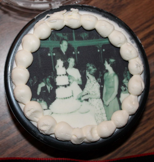 After the show was over we were served dessert, which consisted of a small round cake (white cake with raspberry filling) with a picture of Walt and Lilly Disney celebrating their 30th anniversary, which took place at the Golden Horseshoe Saloon on the day before Disneyland opened to the public. Cast members also offered us coffee to have with our dessert. Although it seemed we were a bit rushed before the show, we did not feel rushed to finish our meal before leaving. I liked that.