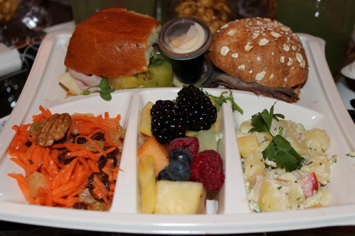 We later returned for the annual passholder show. Again, the doors opened a half hour before the show began. At our tables were four clear plastic boots filled with Frito corn chips and four plastic cups of mint julep. As everyone sat in our seats, cast members doled out our dinner trays. They had regular and vegetarian fare. All of us had the regular meal, which included a ham sandwich, roast beef sandwich, carrot salad, cut fruit, and potato salad. We were also served honey mustard and horseradish sauce for the sandwiches. We all thought the food was decent. Not everyone at our table likes mint julep, and we found out we could request sodas or water, and did so. They do not advertise this, but were very accommodating when we asked for the drinks.