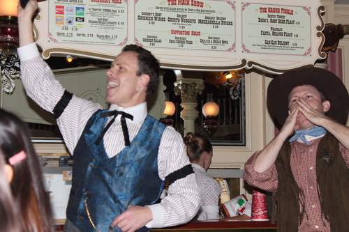 The show is performed while guests are eating their meal, and this works fine for the people facing the stage, but for those whose backs face the stage, it is a little awkward trying to eat and watch the show at the same time. I think this would be one of our main complaints about the event. Once the show begins, the cast members stand to the side, so make sure you get everything you need before it starts. This time, we sat towards the back of the saloon, and I think we had a better view because part of the show takes place among the guests, and you get a better vantage point.