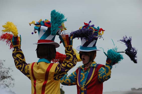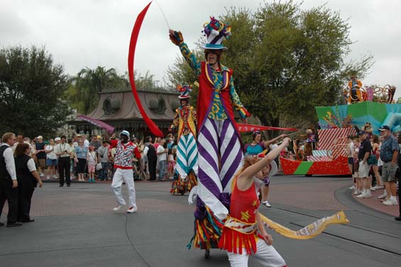 The performers and characters interact with the crowds. The performers on stilts bend down to the kids. It is really a high energy show.