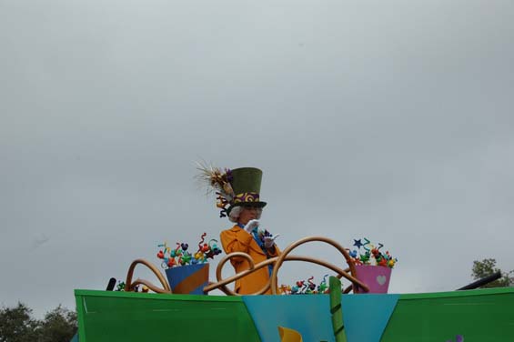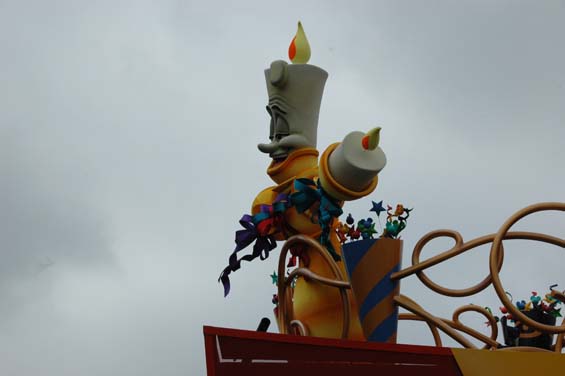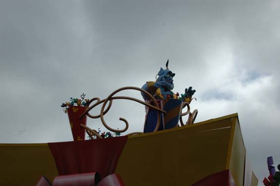 It starts down by City Hall and moves down Main Street towards the castle. There are 5 floats. One has a performer on it along with Mickey and Minnie. The other 4 have big boxes with bows on them. They come down Main Street and turn right around the hub. That would be the best place to watch the parade from. They circle the hub once and the main float stops in front of the castle. The Mad Hatter, Lumiere, Sebastian, Genie appear from the boxes. There are some different characters in this parade. But I was surprised to see that Stitch wasn’t in this parade.