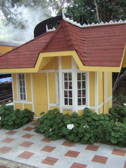 This train depot was built as a playhouse for Ollie’s children and had fallen into disrepair. Since one of the Carolwood Society’s missions is the restoration of pieces that played a pivotal role in the history of trains and their affiliation with the Walt Disney family, friends, and company, they were called upon to restore the depot after Ollie’s passing. Various tiles around the depot show names of donors to the project.