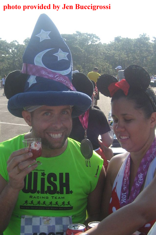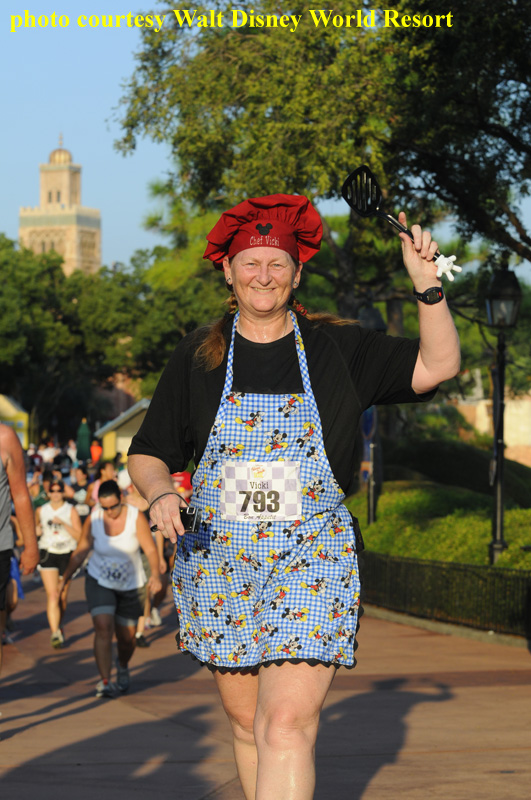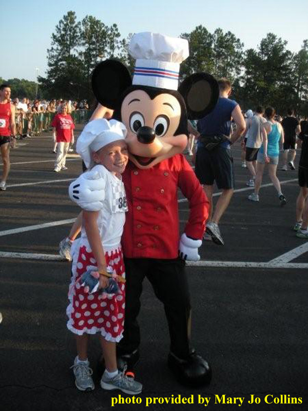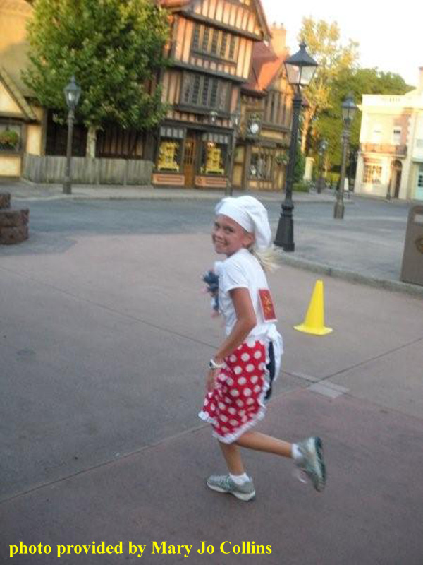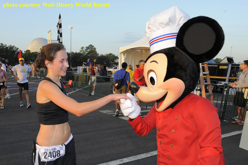 After Hollywood Studios, runners headed to EPCOT. They completed the mile around the World Showcase counter-clockwise from UK to Mexico, over the bridge past the Odyssey Center, into Future World, and to the finish line. When describing the final third of the race, Emily mentioned, “it really helped that the cast members cheered us on. They really liked my chef’s outfit. The best part though was when I got to hug Mickey Mouse when I crossed the finish line.” [I wonder how sweaty Mickey got from all those finisher hugs?]