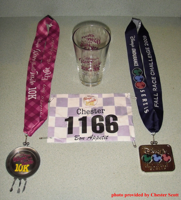 It was a hot and steamy morn for 4,000+ competitors in the final Race For The Taste 10K. Runners started arriving around 5:00 am at Disney’s Wide World of Sports for the 7:00 am race start. It was already 75° with 97% humidity, and sure to get hotter as the sun rose. Jose Henriquez of Orlando, FL was the overall winner completing the 6.2 mile course in 35:22 minutes (5:44 min/mile pace). Sonja Friend-Uhl of West Palm Beach, FL was the first woman across the finish line (fourth finisher overall) in 36:34 min (5:53 min/mile pace). To read more about this event and see photos of the new medal for the Fall Race Challenge continue below the break.