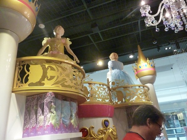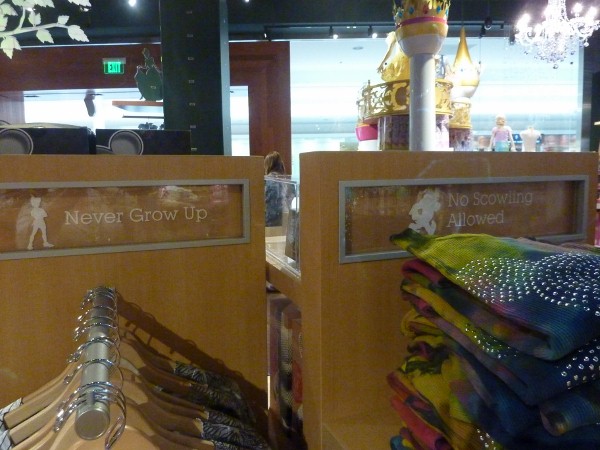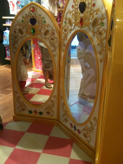 The girls were frankly pretty fascinated with it for quite a while – if you have a Princess-freak Diva on your hands – you may be in trouble. For us, it wasn’t a fight to get them out, but they did have to make sure they watched all the video clips of the different princesses. Another thing to keep in mind, these are also the only mirrors in the store. If you are going to try on the adult clothing or new Disney Couture shirts they offer, you are going to have to squat a bit…
