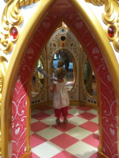 As you can see in the photo, the castle walls are fixtures for princess costumes and accessories. But then you step inside and take, for example, Ariel’s or Tiana’s crown or scepter off the wall and step up to the mirror. Wave the scepter or wear the crown, as Lily is doing in the photo, and a miracle happens.