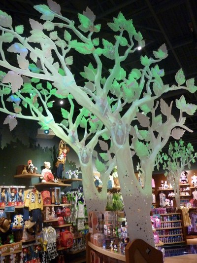 Since I mentioned them briefly, I want to pick up the topic of the trees. They are made with white projection screens and they grow upward from the permanent fixtures. When the store is open, they come to life, with leaves and a variety of Disney characters.