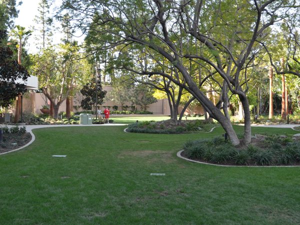 Image: Frontier meadow planter, formally the site for the Dancing Waters and Fantasy Waters shows. The fountain pool has been covered and planted. The operator console sat to the far left near the door to the fountain equipment room. The backdrop wall was the old fiber optic color display. The lawn area was a sunken amphitheater for audience viewing. I’ve spent many a night watching these shows, so I’m pleased that this area was preserved.