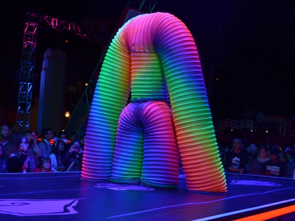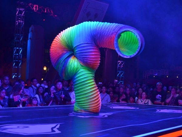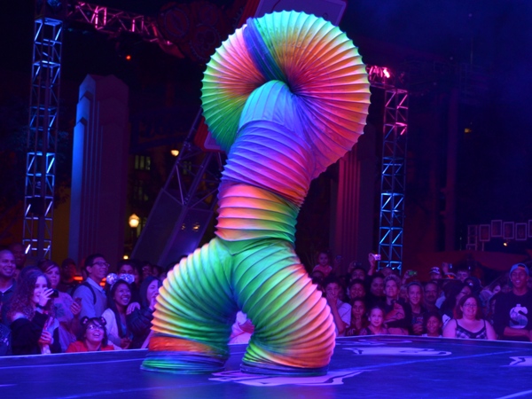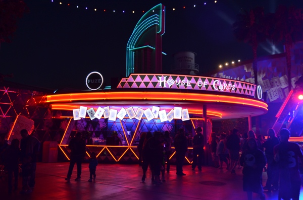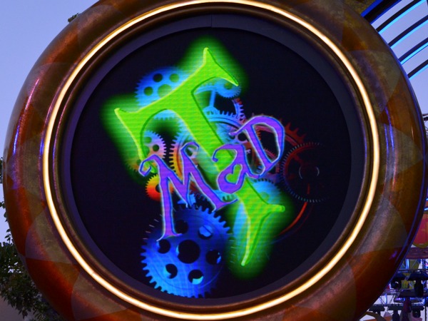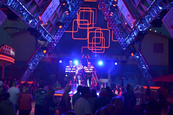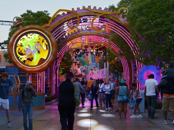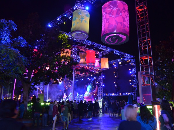 The size of this party is a bit smaller than the previous ElecTRONica street party. ElecTRONica covered both the main street of Hollywood Land and the back section from Muppet Vision 3D to Monsters, Inc. The main street is now taken up by the Red Car Trolley (making overhead lighting and sound towers difficult) and so the Mad T Party has been placed into the entire back area. This means that more folks are concentrated in a smaller area, but they have packed in more facilities, so you’re just not walking around as much.