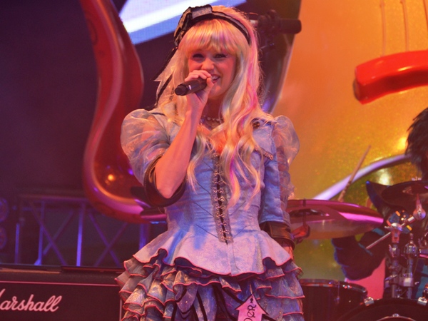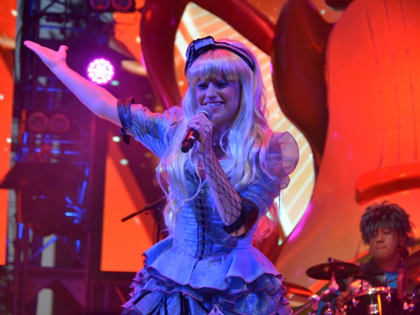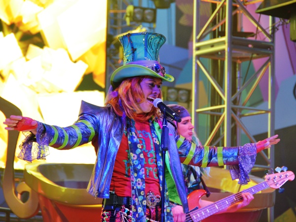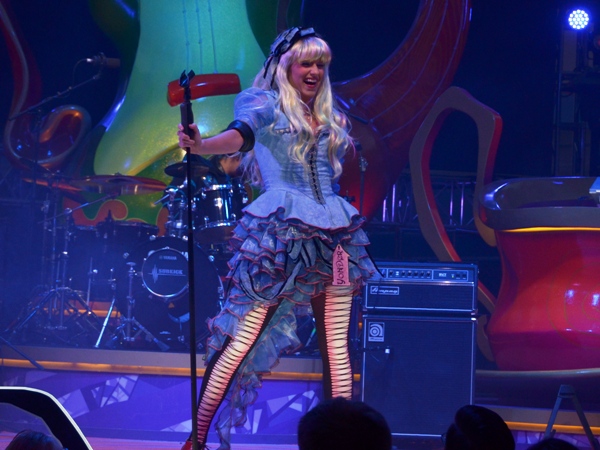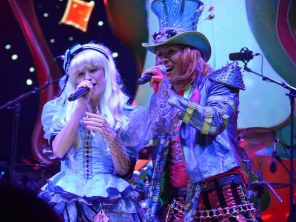 And of course, what band would be complete without their featured solo performer – and for the Mad T Party it’s Alice herself! Alice is not the shy little girl she once was when she first fell down into Wonderland; she now has a killer voice, a magnetic personality and the biggest smile to light up the stage. Also dressed in a wild costume (that reminded me a bit of Cyndi Lauper), Alice steals the show. And judging from the hoots and hollers, the rest of the fans agree (including me). The songs are a mix of ‘80s to modern, but one of my favorites was the classic Blondie tune “Call Me” with Alice as soloist and accompanied by a flourish of lighting and graphic effects on the stage’s back wall video display.