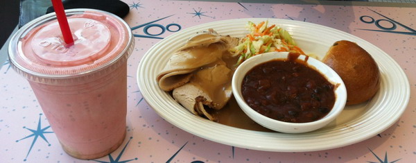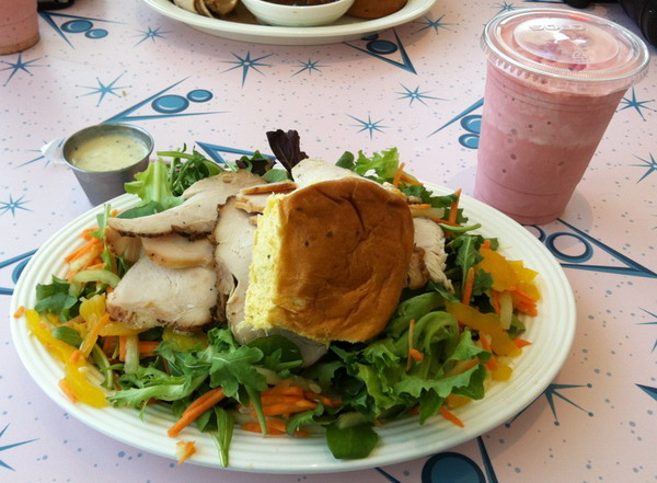 On Saturday, I ate at Flo’s Cafe with Disneyland DIS Unplugged podcaster, Wayne Toigo. Wayne had the turkey, and the two sides he picked were the coleslaw and vegetarian baked beans. I ordered the Citrus Turkey salad. Both meals came with a roll. Since we were in a diner, we decided on strawberry shakes. We both really enjoyed our meals. My salad was tasty, and was actually pretty filling. Wayne said his turkey was delicious, and we both enjoyed our strawberry shakes. I was pretty surprised when I tasted the little candies in the shakes. They were a tasty little surprise.