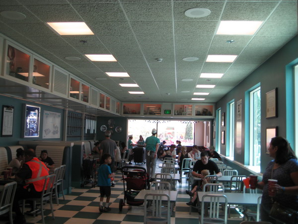 Before I get to the food, though, let me tell you about the diner itself. The main entrance opens on to Route 66, and is lined on either side with gas pumps. Tucked between the pumps, in the shade of the awnings are tables, giving diners a nice place to enjoy their meal while enjoying the ambiance of the town of Radiator Springs.
