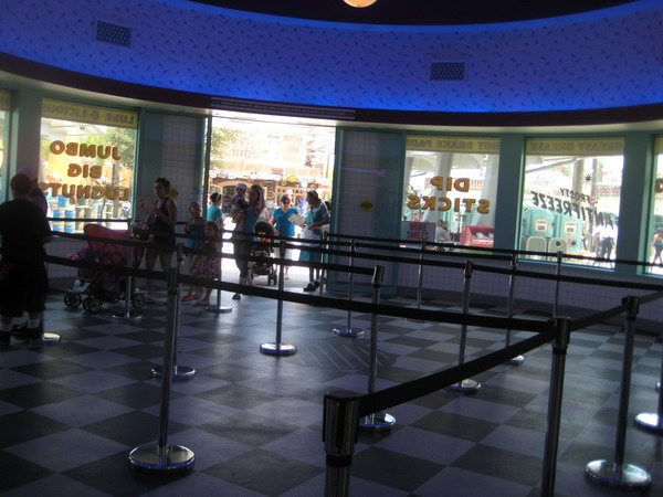 When you enter the café, cast members give you a menu to look over as you wait in the queue to order your food. You will be entertained with music of the 50s and 60s, while the colored lights in the ceiling change to the tune of the music being played.