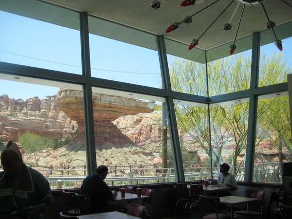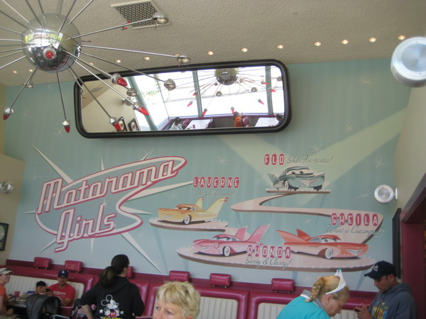 The dining area to the left is dedicated to the singing career of Flo and the Motorama Girls. This side of the café may very well prove to be the more popular area guests will choose to dine due in large part to the spectacular view of Ornament Valley and the Radiator Springs Racers. I ate in this fun room on Saturday, and I have to admit, this is my favorite area of the café.