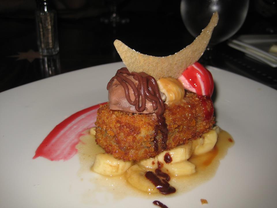 Since we had a leisurely lunch, we decided to share some dessert. We ordered the Fried Banana Split Monte Cristo Sundae and the Peach and White Chocolate Mousse Cannolis.
