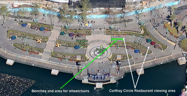 The picture below shows the area where guests who dine at the Carthay Circle Restaurant stand to watch World of Color. Since we were not sure where we needed to go, we asked the cast members, who very helpfully pointed the way. There is a sign at the entrance to the section that says Carthay Circle viewing section. The first night we saw the show we arrived 45 minutes ahead (8:15pm), and had excellent viewing. The second night we saw the show we arrived just as it was starting (which is why it really is better to see the 10:15pm show after dinner instead of the 9pm show), and so even though we were in a good area, there were people in front, and being 5′ tall, I had to shift now and then so I could see the show. My understanding is that even if this area is full, the cast members will put Carthay Circle guests in the best viewing locations available. I was really pleased with the positive service here.